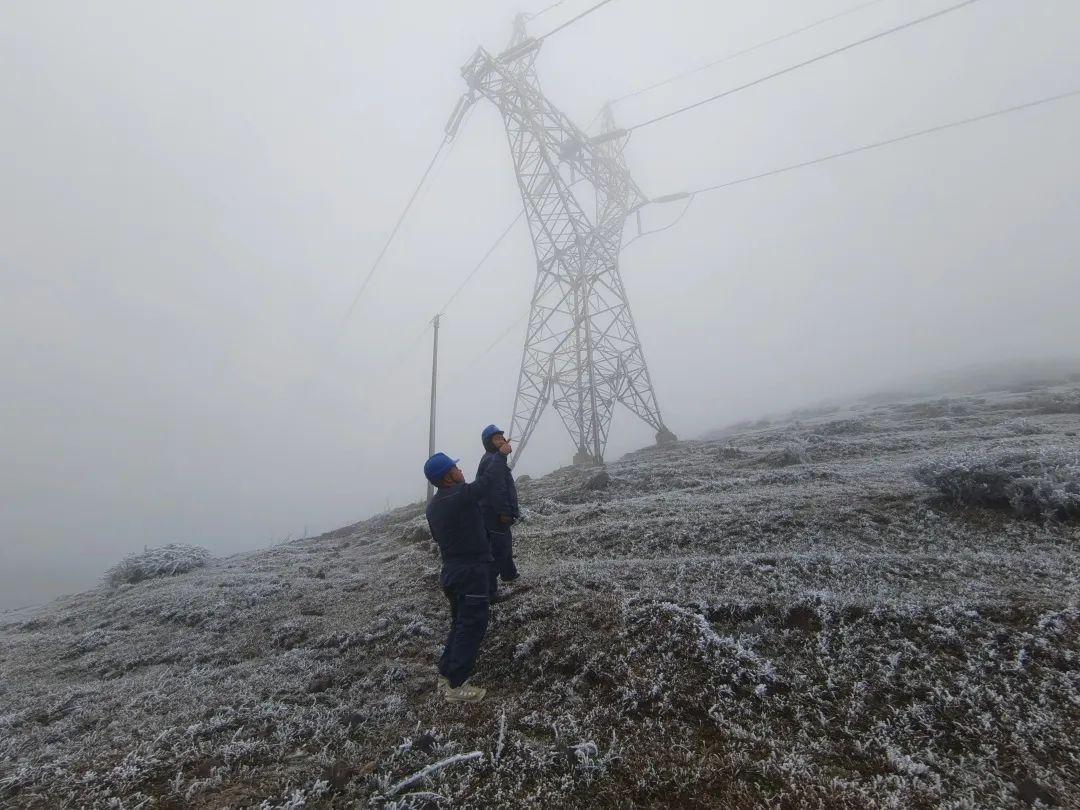 南方电网贵州毕节供电局输电管理一所工作人员,在220千伏乌威线7号杆开展覆冰观测,掌握线路运行情况。(翟勇?摄)