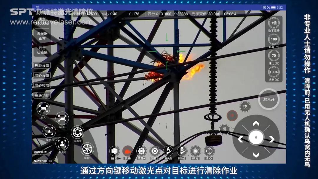 开始清障作业。通过方向键移动激光点对目标物进行清除。(清障前已使用无人机确认鸟窝内无鸟)