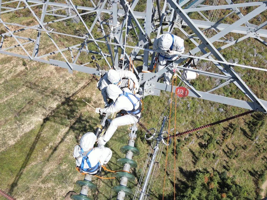南网超高压柳州局线路运维人员在500千伏牛从线开展带电作业,紧急消除线路缺陷。(焦伟军 摄)
